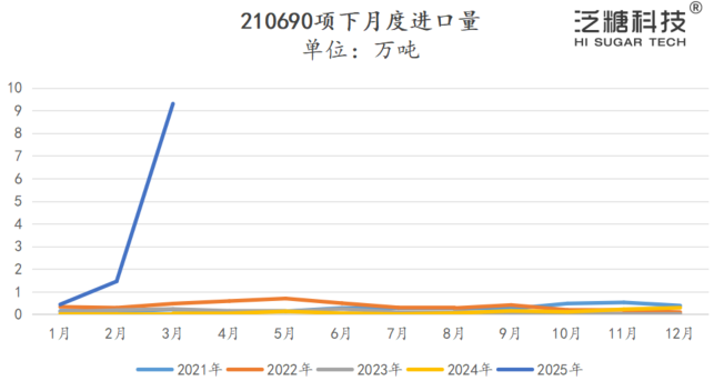 2025年3月,我国进口2106906项下两类商品共9.3万吨,同比增长9.26万吨,增幅22866.06%,创下历史进口记录。其中含香料或着色剂的甘蔗糖或甜菜糖水溶液(税则号2106.9061)进口5.43万吨,同比增加5.42万吨;甘蔗糖、甜菜糖与其他食品原料的简单固体混合物,蔗糖含量超过50%(税则号2106.9062)进口3.86万吨,同比增加3.82万吨。