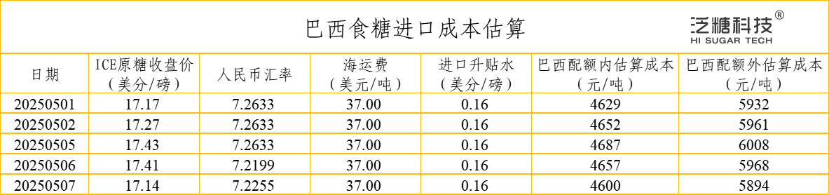 2025年5月7日,ICE原糖收盘价为17.14美分/磅,人民币汇率为7.2255。经测算,配额内巴西糖加工完税估算成本为4600元/吨,配额外巴西糖加工完税估算成本为5894元/吨;与日照白糖现货价比,配额内巴西糖加工完税估算利润为1690元/吨,配额外巴西糖加工完税估算利润为396元/吨。