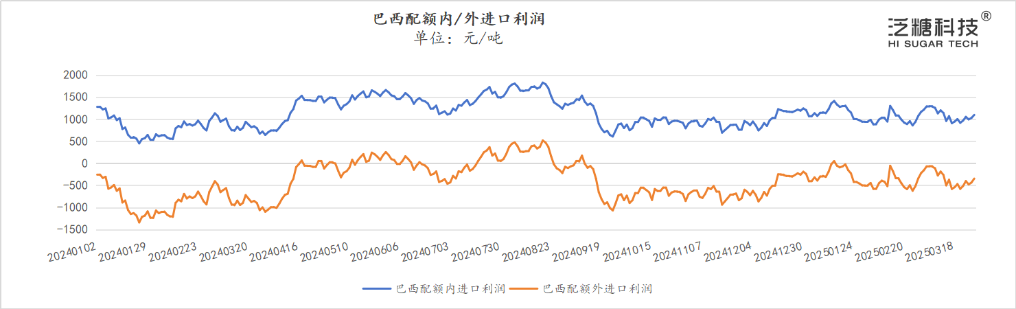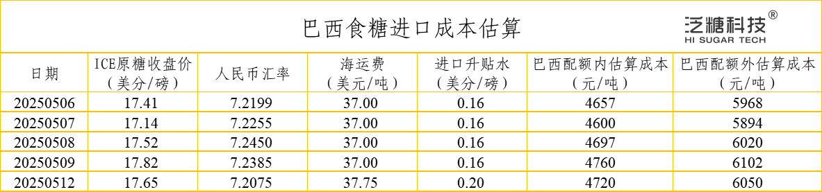 2025年5月9日,ICE原糖收盘价为17.65美分/磅,人民币汇率为7.2075。经测算,配额内巴西糖加工完税估算成本为4720元/吨,配额外巴西糖加工完税估算成本为6050元/吨;与日照白糖现货价比,配额内巴西糖加工完税估算利润为1570元/吨,配额外巴西糖加工完税估算利润为240元/吨。