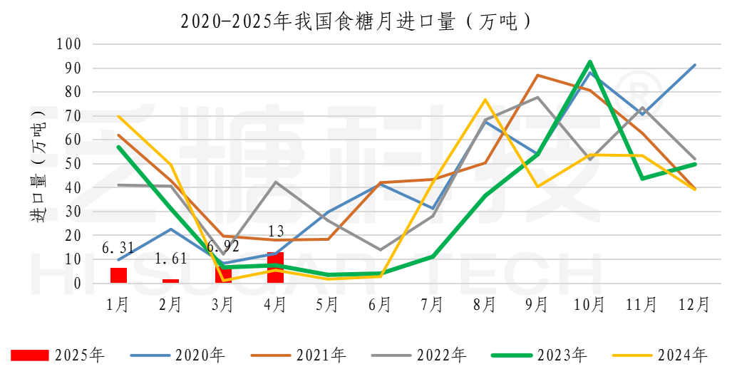 2025年4月我国进口食糖13万吨,同比增加7.57万吨