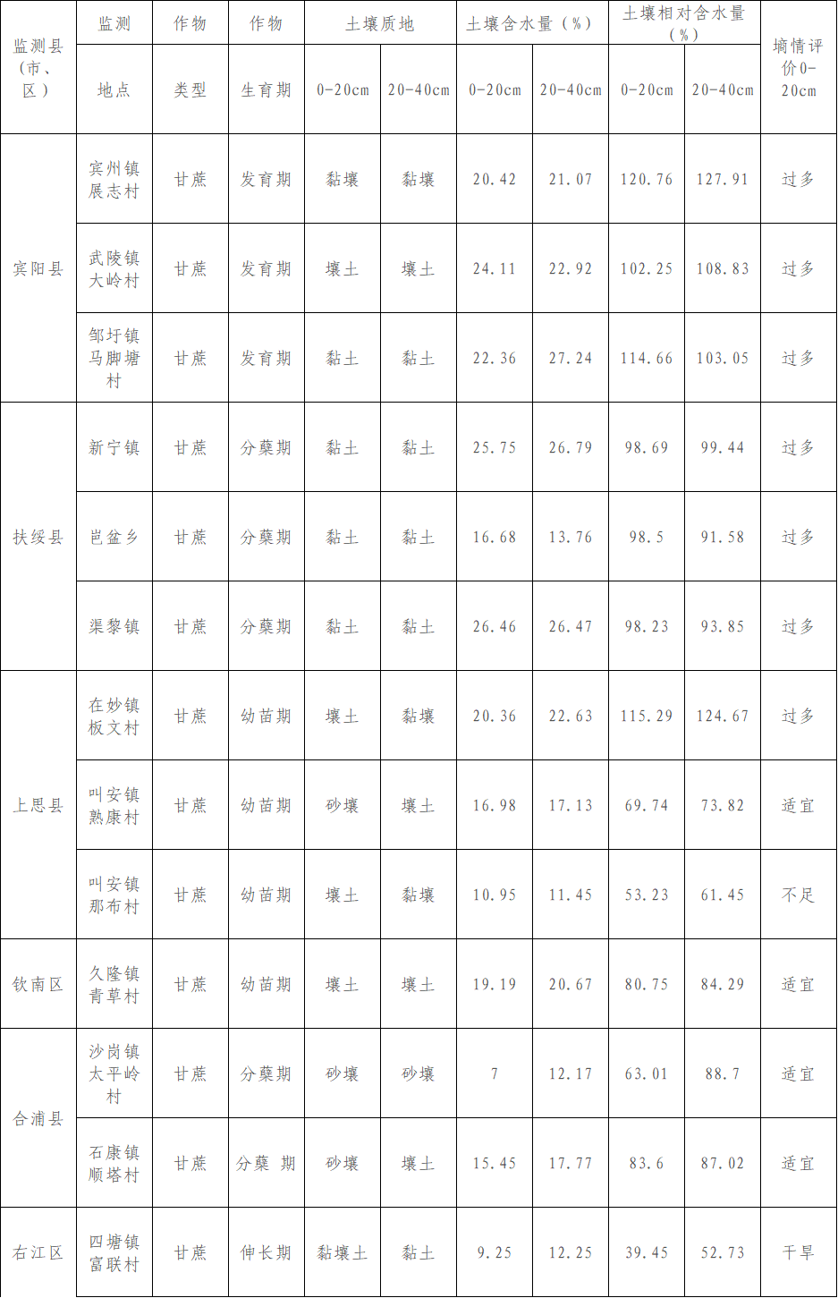 2025年4月26日—5月12日,全区气温总体平稳,大部最高气温32—34℃。前期以多云天气为主,后期桂北、桂中、桂东有中到大雨,局地暴雨,伴强对流天气。据全区14个农田墒情监测站42个监测点的监测数据显示,其中有11个点墒情过多,25个点墒情适宜,墒情适宜和过多的点数占比85.71%,较上期(4月11日—25日)增加28.57个百分点;3个点墒情不足,3个点墒情干旱,墒情不足和干旱的点数占比14.29%,较上期减少28.57个百分点。整个监测周期农田墒情接近九成以上适宜,较上期干旱程度大大缓解。全区42个监测点0—20厘米耕层监测结果如下: