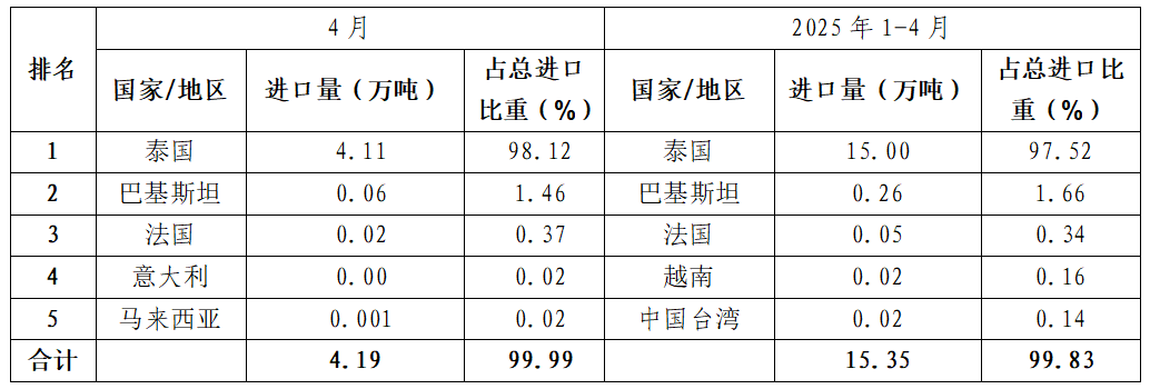 1-4月,我国累计从东盟国家进口税号1702.90项下糖浆与白砂糖预混粉16.76万吨,占比96.43%;越南是最大的进口来源国,进口数量为10.05万吨,占进口总量的57.85%;泰国位列第2,占比由去年的91.46%降至29.36%。