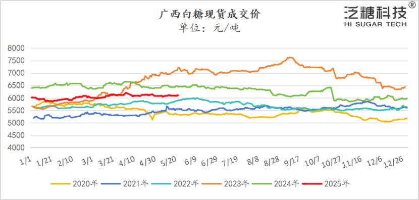 广西白糖现货成交价本周运行区间为6086~6104元/吨,周五收盘价6093/吨,周环比上涨5元/吨,涨幅0.08%。