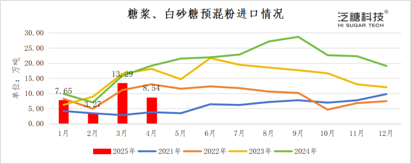 2024/25榨季截至4月,全国累计进口进口糖浆和预混粉(含税则号1702.90、2106.906)共96.67万吨,同比增加3.27万吨,增幅3.5%。