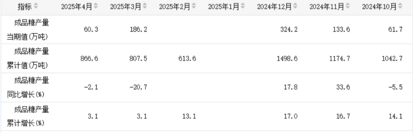 国家统计局最新公布的数据显示,2025年4月我国成品糖产量60.3万吨,同比下降2.1%;1-4月为866.6万吨,同比增长3.1%。
