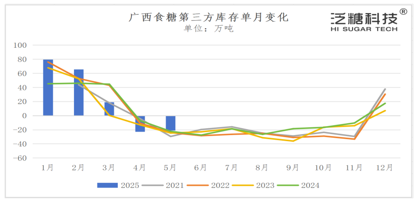截至5月20日,广西食糖第三方仓库库存数量约138万吨,较去年同期增加约19万吨,略高于近5年同期均值。5月广西食糖第三方库存量环比4月下降约21万吨,去库速度为近5年同期最低。