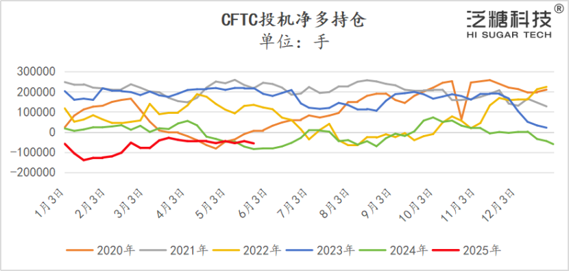 截至5月20日当周,ICE原糖期货+期权总持仓为933514手,较前一周增加7648手。投机多头持仓169896手,较前一周减少5540手;投机空头持仓226527手,较前一周增加5566手;投机净空持仓为56631手,较上周增加11106手。