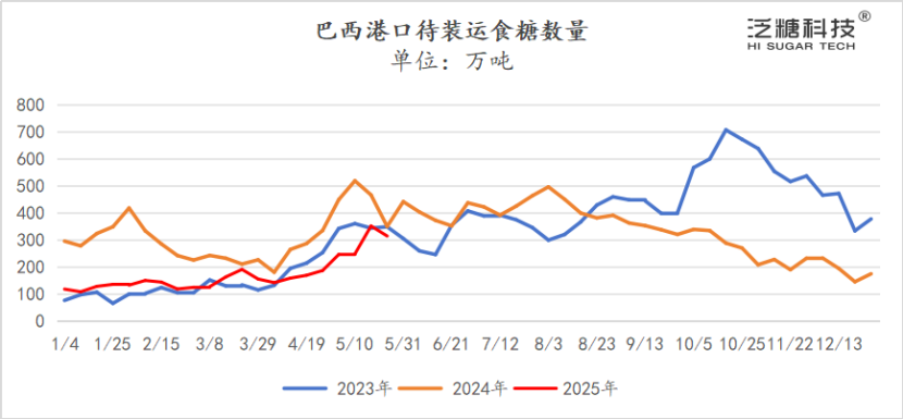 桑托斯港等待出口的食糖数量为215.45万吨,帕拉纳瓜港等待出口的食糖数量为71万吨。