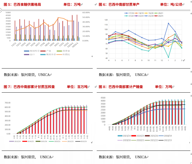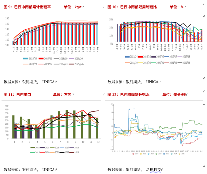 当前巴西25/26榨季压榨开启。4月下半月,巴西中南部地区甘蔗入榨量为1772.5万吨,较去年同期的3499.8万吨减少1727.3万吨,同比降幅49.35%;甘蔗ATR为110.64kg/吨,较去年同期的115.22kg/吨减少4.58kg/吨;制糖比为45.82%,较去年同期的48.22%减少2.4%;产乙醇9.85亿升,较去年同期的15.24亿升减少5.39亿升,同比降幅35.37%;产糖量为85.6万吨,较去年同期的185.3吨减少99.7万吨,同比降幅达53.79%。2025/26榨季截至4月下半月,巴西中南部地区累计入榨量为3425.7万吨,较去年同期的5111.5万吨减少1685.8万吨,同比降幅达32.98%;甘蔗ATR为106.94kg/吨,较去年同期的112.51kg/吨减少5.57kg/吨;累计制糖比为45.27%,较去年同期的46.98%减少1.71%;累计产乙醇19.01亿升,较去年同期的23.47亿升减少4.46亿升,同比降幅达19.03%;累计产糖量为158万吨,较去年同期的257.5万吨减少99.5万吨,同比降幅达38.62%。