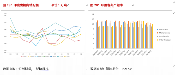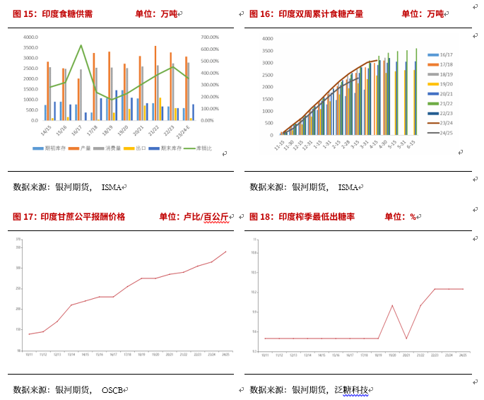 印度受天气影响预计本榨季将提前收榨,24/25榨季产量预估在2600万吨左右。印度糖和生物能源制造商协会(ISMA)发布的数据显示,截至5月15日,印度糖产量已达2574.4万吨,只有两家糖厂依然运转。仍在运转的两家糖厂位于泰米尔纳德邦,那里的主要压榨工作仍在进行中。为了增加产量,南卡纳塔克邦和泰米尔纳德邦的几家糖厂预计将在特殊的压榨季节(通常从2025年6/7月持续到9月)恢复运营。从历史上看,卡纳塔克邦和泰米尔纳德邦的在这段特殊压榨期会贡献大约40-50万吨糖。