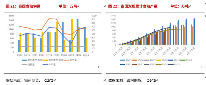 泰国当前已收榨,截至2025年4月1日,泰国甘蔗累计压榨9198万吨;累计产糖1004万吨,同比+15%。泰国1月出口糖42.1万吨,同比增加16.6%,但24/25榨季开始以来去年10月至今年1月的累计出口量仍是近三个榨季最低,为约98万吨,同比小幅减少3.6%。在本榨季截至2月下旬糖产量同比增长7.5%,达到约810万吨的情况下,近期全球最大进口国印尼的需求减弱对泰国糖升水形成压制。
