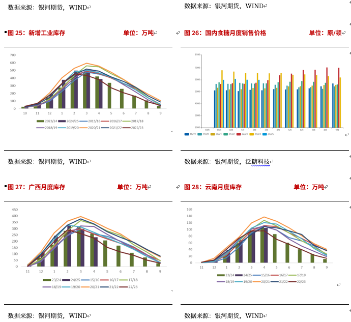 国际方面,考虑到巴西即将迎来供应高峰,预计全球库存即将进入累库阶段,短期贸易流偏紧将有所缓解,预计原糖整体维持震荡运行,短期则根据阶段性生产数据影响盘面节奏,后续还需关注巴西生产进度及实际增产幅度。国内方面,产销速度偏快、去库前置。考虑到糖浆进口政策进一步收紧,产需缺口如何补足成为市场焦点。考虑到进口糖当前并未大量进入国内市场,预计对糖价有所支撑。而糖价受到原糖价格偏弱、进口糖价格下跌的拖累,预计上行空间有限,短期糖价维持震荡走势。
