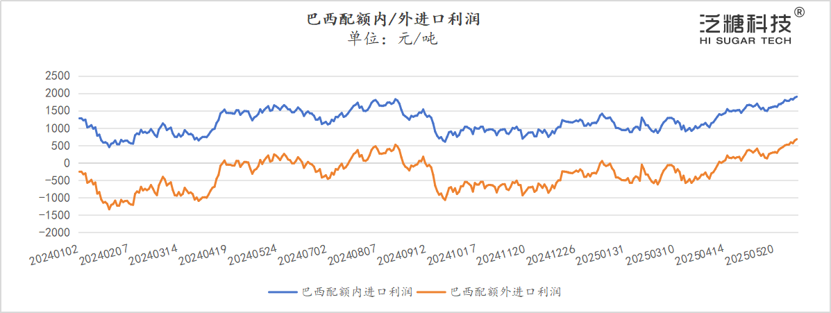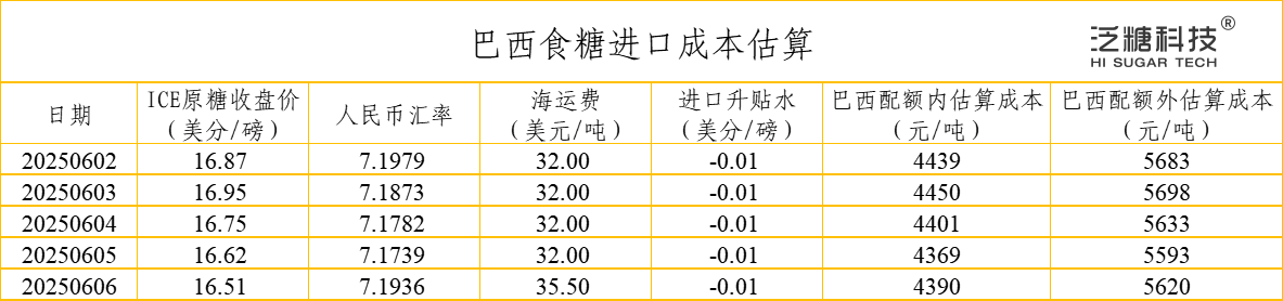 2025年6月6日,ICE原糖收盘价为16.51美分/磅,人民币汇率为7.1936。经测算,配额内巴西糖加工完税估算成本为4390元/吨,配额外巴西糖加工完税估算成本为5620元/吨;与日照白糖现货价比,配额内巴西糖加工完税估算利润为1810元/吨,配额外巴西糖加工完税估算利润为580元/吨。