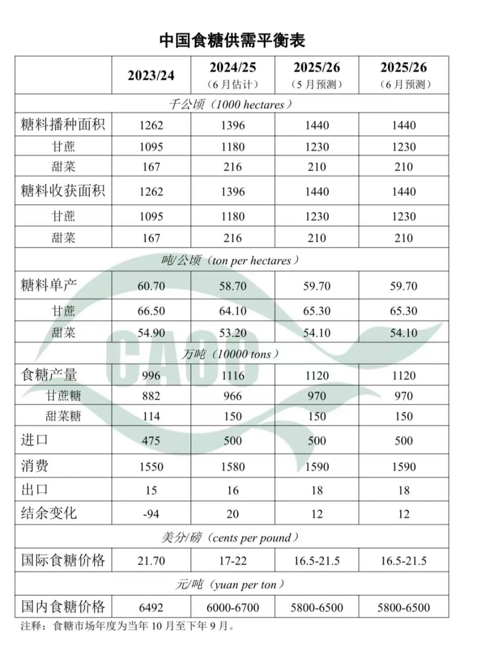 本月对2024/25榨季食糖产量数据进行校准,调增1万吨至1116万吨。2024/25年度食糖生产已经结束,据中国糖业协会统计,截至5月底,全国累计产糖1116万吨,同比增120万吨;累计销糖811万吨,同比增152万吨;销售进度72.7%,同比加快6.5个百分点。对2025/26榨季中国食糖供需形势预测数据不作调整。
