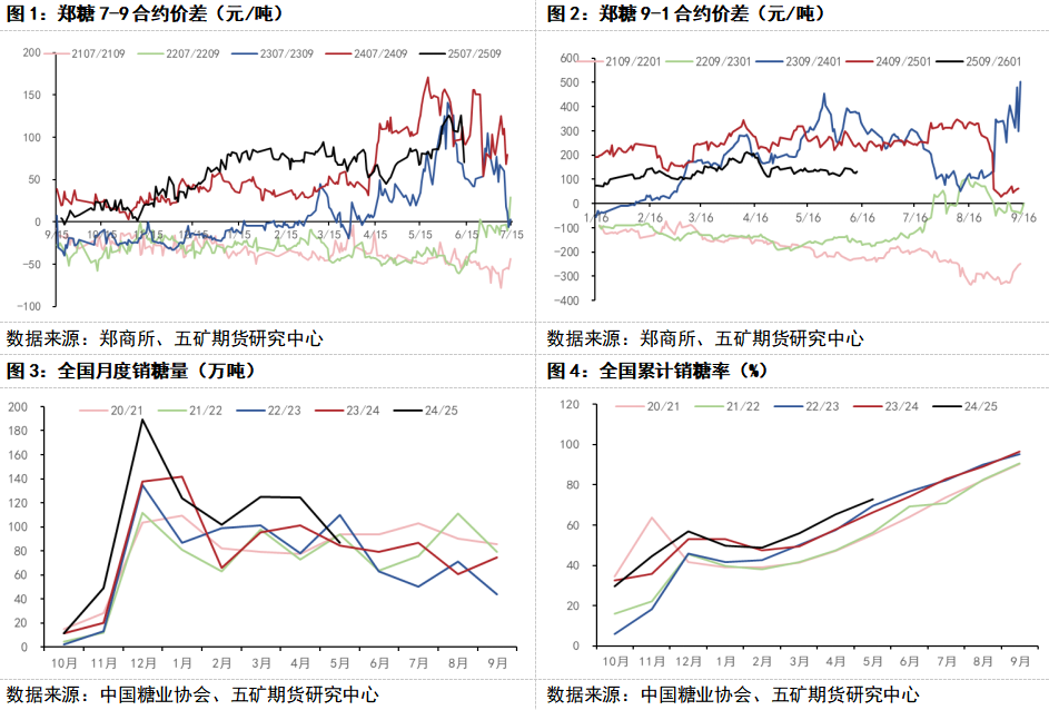 从4月下旬开始,郑糖7-9合约价差逐步走出正套行情,反映的是4月和5月国内较强的现实基本面。据中国糖业协会公布的最新数据显示,5月全国单月销糖86.92万吨,同比增加2.29万吨;全国工业库存为304.83万吨,同比减少32.21万吨;累计产销率72.69%,同比加快6.52个百分点。虽然5月的全国产销数据表现依然较好,还是得益于4月产销率创历史新高,而5月全国单月销糖数量与近10年同期平均销量相差无几,环比4月是减少37.54万吨。