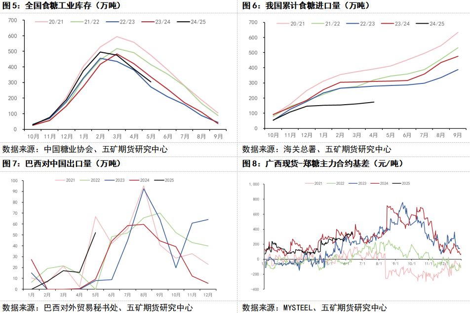 另一方面,从4月下旬开始,郑糖9-1合约价差开始走出反套行情,反映的是市场交易进口成本下降,以及下半年进口供应环比增加的预期。据海关总署公布的数据显示,2025年4月份我国进口食糖13万吨,同比增加7万吨。2025年1-4月份我国进口食糖27万吨,同比减少97万吨,降幅77.86%;2024/25榨季截至4月底,我国进口食糖174万吨,同比减少137万吨,降幅44.18%。虽然今年1-4月的进口数量明显下滑,但是从4月下旬开始,配额外进口利润大幅抬升,目前已经超过500元/吨,为近5年最佳的进口窗口期。据巴西对外贸易秘书处数据显示,4月和5月巴西对中国出口原糖分别为15.6万吨和52万吨,合计67.6万吨,为近5年的新高,4月和5月从巴西出口发运的糖,预计会分别在5月和6月到达中国港口。