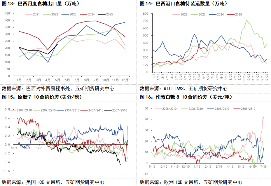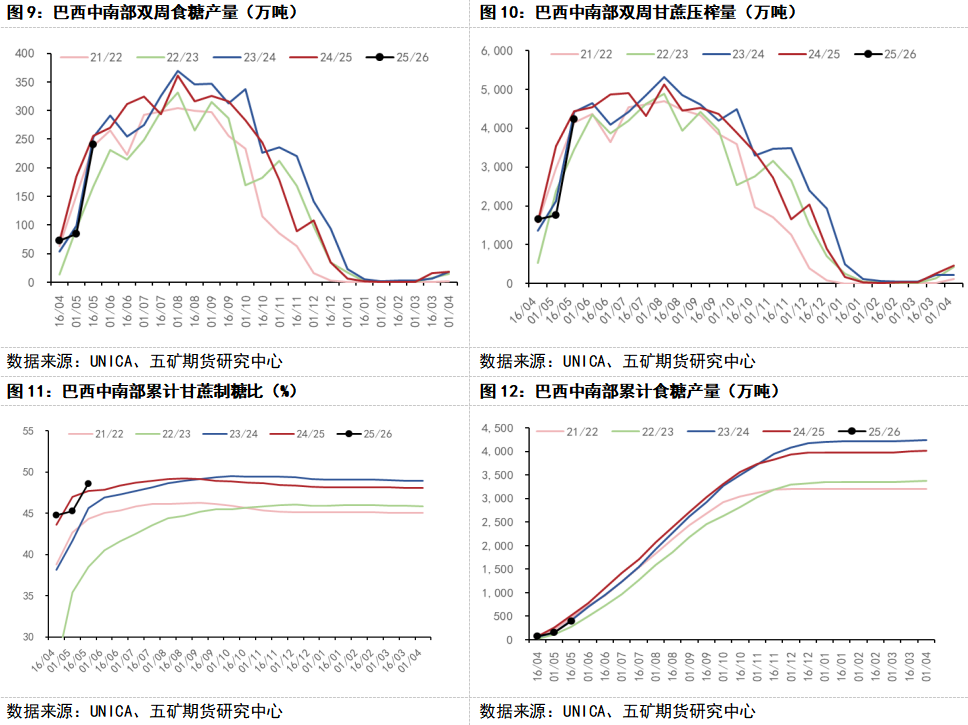 二季度后,巴西供应开始上市。据UNICA最新数据显示,5月上半月,巴西中南部地区甘蔗入榨量为4231.9万吨,较去年同期减少274.6万吨,同比减幅为6.09%;甘蔗制糖比例为51.14%,较去年同期增加2.9个百分点;产糖量为240.8万吨,较去年同期减少17.6万吨,同比减幅为6.8%。2025/26榨季截至5月上半月,巴西中南部地区累计入榨量为7671.4万吨,较去年同期减少1946.6万吨,同比减幅为20.24%;累计制糖比为48.61%,较去年同期增加1.01个百分点;累计产糖量为398.9万吨,较去年同期减少117万吨,同比减幅为22.68%。虽然巴西因此前干旱天气影响导致甘蔗单产下降,但甘蔗制糖比例创历史新高,预计整体糖产量仍维持在历史高位水平。
