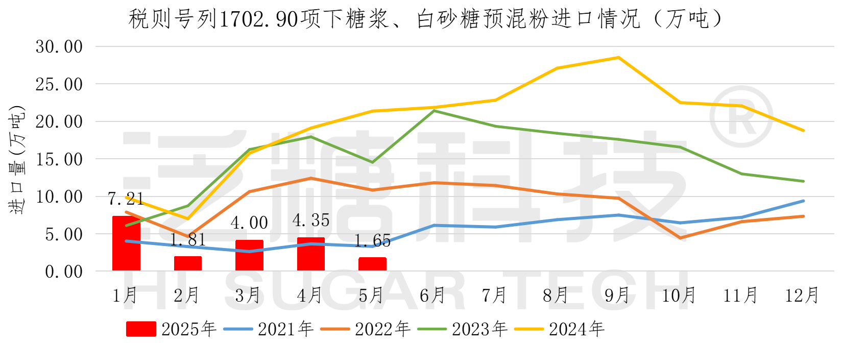 2024/25榨季截至5月,全国累计进口2106.90.6项下糖浆、预混粉共16.28万吨,同比增加15.94万吨,增幅4707.55%。