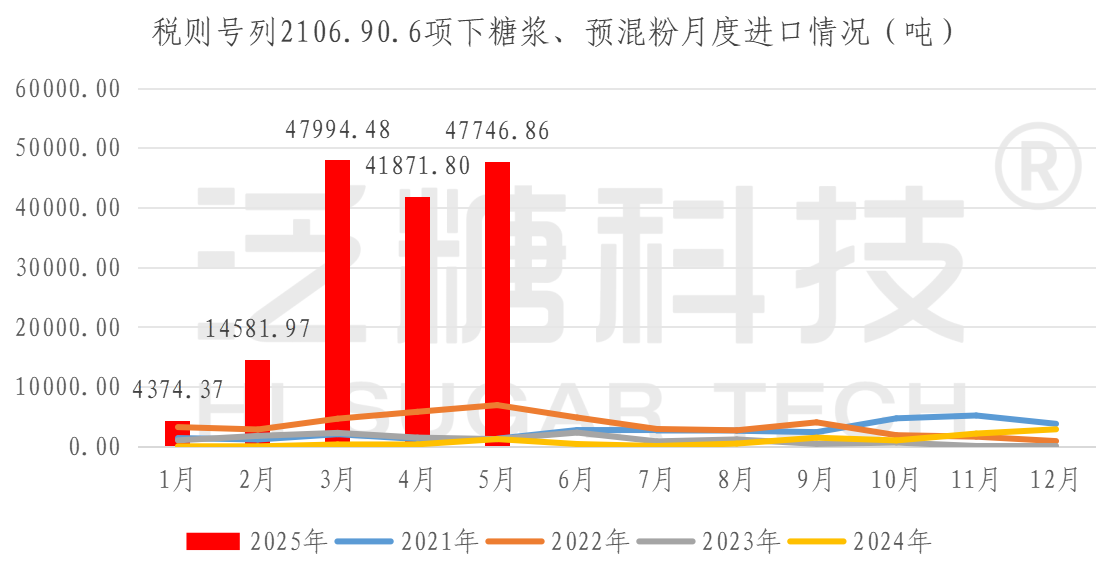 2025年5月,我国进口2106.90.6项下糖浆、预混粉共4.77万吨,同比增长4.64万吨,增幅3572%,为历史同期最高。