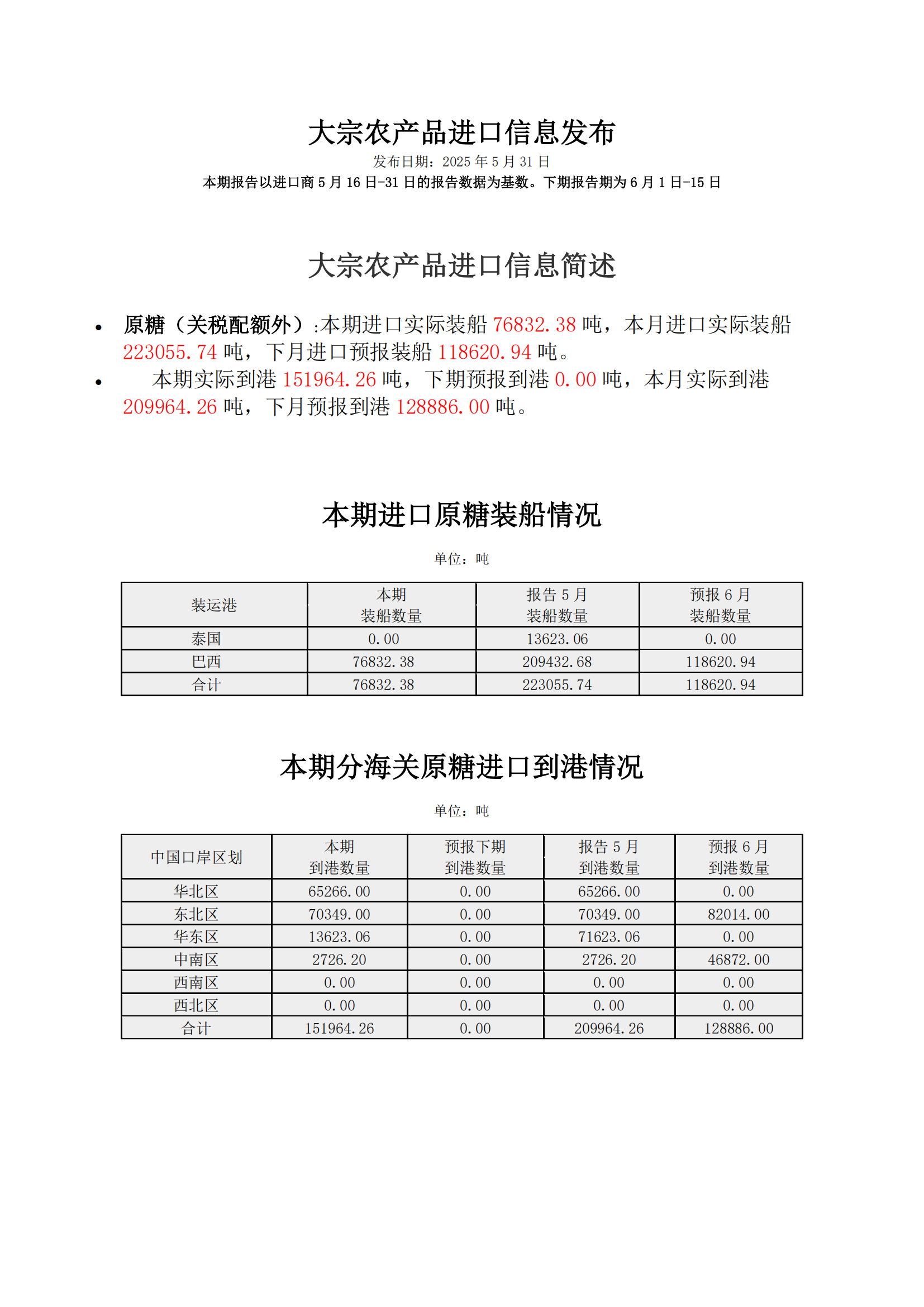 商务部:2025年5月关税配额外原糖实际到港21万吨,6月预报到港12.89万吨
