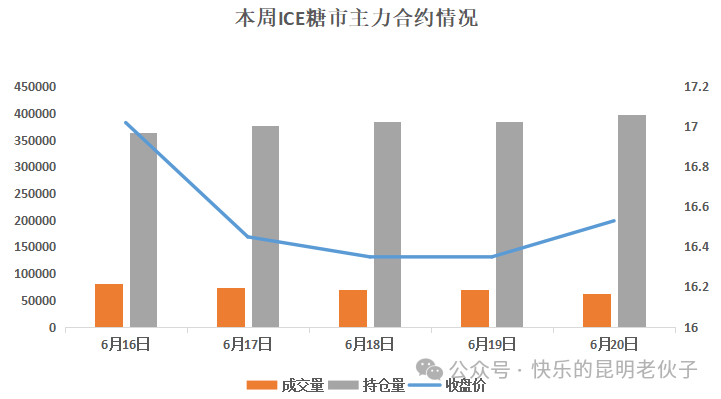 国际糖市ICE:本周ICE糖价主力震荡走弱,至周五时,其收盘价为16.53美分/磅,成交量最高达到8.2万余手,在6.2-8.2万余手之间;本周持仓量持续增加,至周五时为39.7万余手。