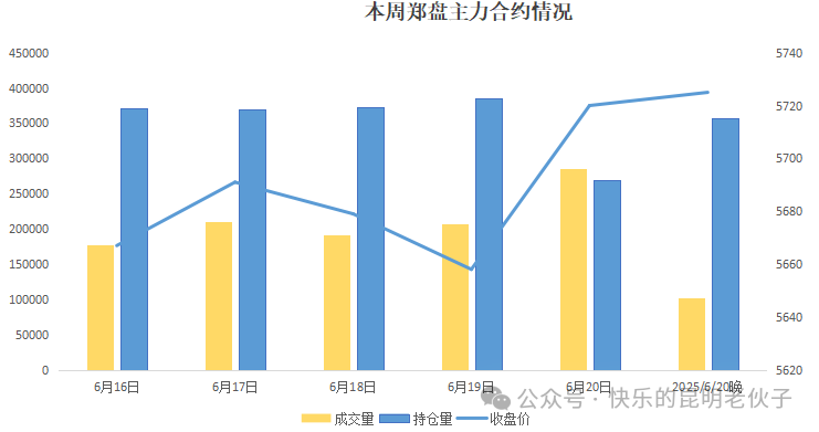 国内糖市郑盘:本周国内糖价郑盘主力合约震荡上行,周五晚以5725元/吨收盘。本周郑盘主力合约成交量最高达28.5万余手,最低约17.8万余手;持仓量在26.9-37.2万余手。