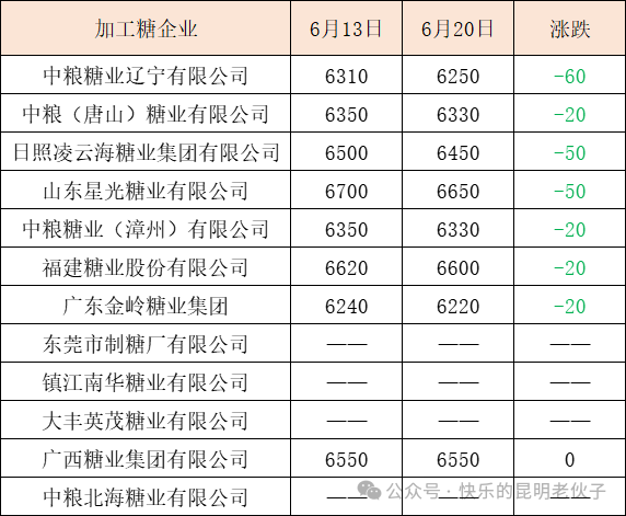本周国内加工企业报价下跌居多,中粮糖业辽宁有限公司较上周下跌60元/吨,中粮(唐山)糖业有限公司下调20元/吨,日照凌云海糖业集团有限公司、山东星光糖业有限公司均下跌50元/吨,中粮糖业(漳州)有限公司、福建糖业股份有限公司、广东金岭糖业集团下调20元/吨,广西糖业集团有限公司与上周持平,其余企业暂不报价。本周加工企业整体成交一般。