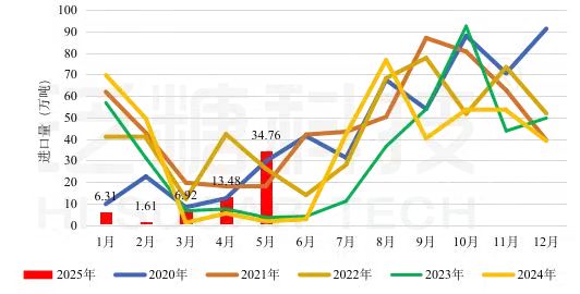 我国5月进口食糖34.76万吨,同比增加33.07万吨。1-5月合计进口食糖63.08万吨,同比减少64.35万吨,降幅50.50%;较近5年同期均值下降60.78万吨,降幅49.07%。