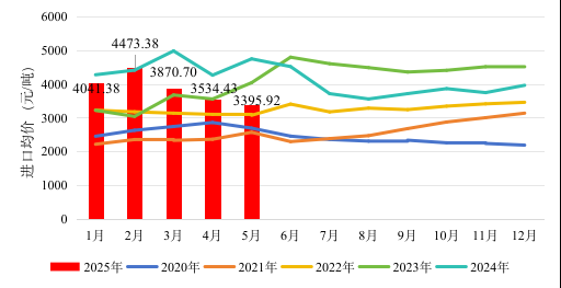 5月食糖进口到岸均价为3395.92元/吨,同比下降1341.51元/吨,降幅28.32%。1-5月的食糖进口到岸均价为3569.62元/吨,同比下降762.39元/吨,降幅17.60%;较近5年同期均值上涨245.84元/吨,涨幅7.40%。