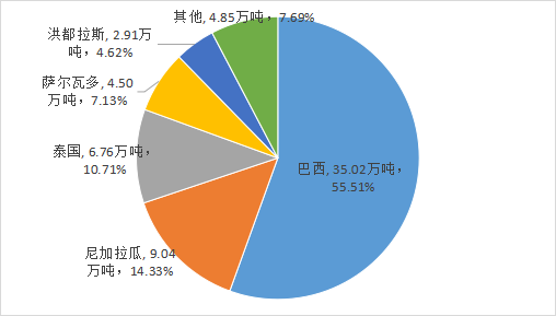 1-5月,我国累计进口巴西食糖35.02万吨,占比55.51%,同比减少71.52万吨。排名第2-5名的来源国分别为尼加拉瓜(9.04万吨)、泰国(6.76万吨)、萨尔瓦多(4.50万吨)和洪都拉斯(2.91万吨)。相较去年同期,今年1-5月我国食糖进口来源国呈现“巴西主导地位减弱,中美洲和东南亚国家占比提升”的特点,主要表现为来源于巴西的食糖占比由去年的83.60%下降至55.51%;来源于尼加拉瓜、洪都拉斯、泰国的进口量显著增长,四者占比合计约36.80%,同比提高28.69%。