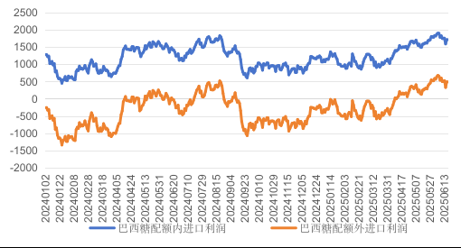 截至6月18日,配额内巴西糖加工完税估算成本约为4448元/吨,配额外巴西糖加工完税估算成本约为5665元/吨,同比分别下降702元/吨、931元/吨。相较国内沿海加工糖厂主流报价6240~6650元/吨,配额外巴西糖进口利润约为575~985元/吨。