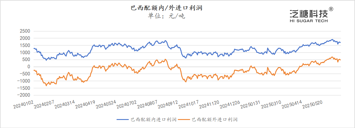 2025年6月27日,ICE原糖主力合约收盘价为16.69美分/磅,人民币汇率为7.1711。经测算,配额内巴西糖加工完税估算成本为4518元/吨,配额外巴西糖加工完税估算成本为5757元/吨;与日照白糖现货价比,配额内巴西糖加工完税估算利润为1642元/吨,配额外巴西糖加工完税估算利润为403元/吨。
