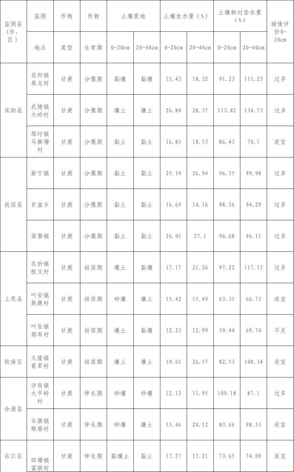 桂南地区:扶绥县监测点土壤相对含水量为96.55%—98.56%,墒情过多,监测点周边主要作物甘蔗,与去年同期相比略矮一两节;合浦县监测点土壤相对含水量为77.15%—109.18%,墒情适宜至过多,监测点周边主要作物是甘蔗、木薯,当前长势良好,甘蔗现阶段处于伸长期,未施肥的地块重施攻茎肥,追肥量为尿素25-30公斤/亩、氯化钾15-21公斤/亩;上思县监测点土壤相对含水量为59.44%—97.22%,墒情大部适宜至过多、局部不足,监测点周边主要作物甘蔗,与去年同期相比矮了一节多,施肥情况:县糖厂推荐亩施有机-无机复混肥30—40公斤,尿素27—31公斤,氯化钾23—27公斤,另增施长效药防虫,培土15—20厘米;钦南区监测点土壤相对含水量为68.60%—82.53%,墒情适宜,监测点周边主要作物甘蔗和木薯,目前甘蔗处于分蘖旺盛期,叶色嫩绿,木薯长势好。
