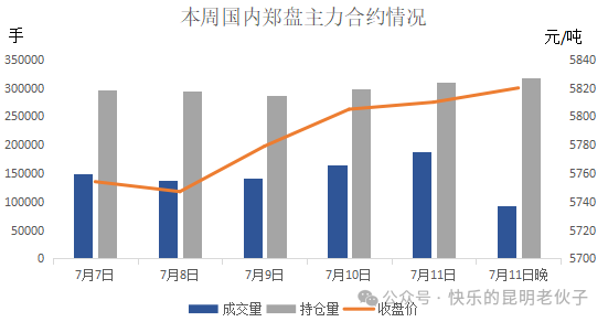 国内糖市郑盘:本周国内糖价郑盘主力合约震荡上扬,周五晚以5820元/吨收盘。本周郑盘主力合约成交量最高达18.8万余手,最低约13.7万余手;持仓量持续增加,至周五时有31.7万余手。