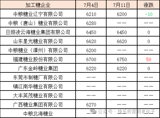 本周国内加工企业报价暂无报价居多,中粮糖业辽宁有限公司下跌10元/吨,中粮(唐山)糖业有限公司暂无报价,日照凌云海糖业集团有限公司、山东星光糖业有限公司与上周持平,中粮糖业(漳州)有限公司暂不报价,福建糖业股份有限公司报价上调50元/吨,广东金岭糖业集团与上周持平,其余企业暂不报价,本周加工企业整体成交一般。
