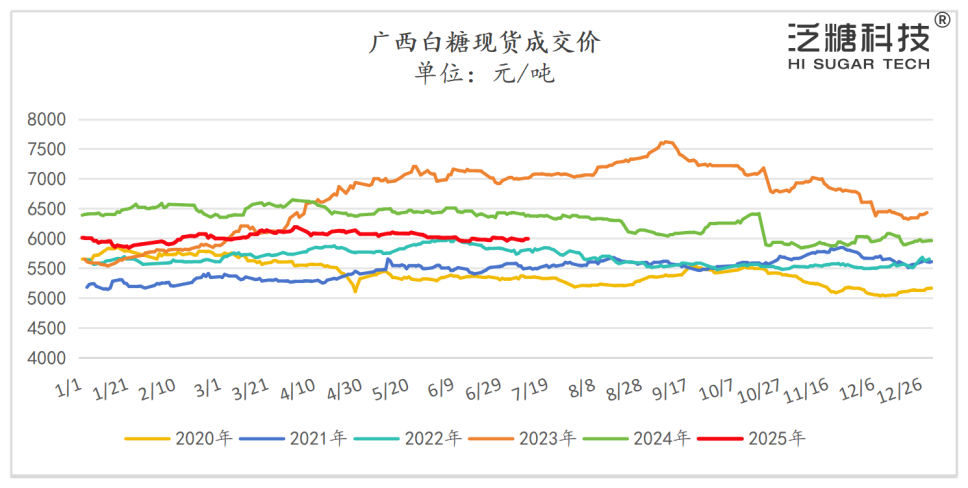 广西白糖现货成交价本周运行区间为5971~5999元/吨,周五收盘价为5997/吨,周环比下跌9元/吨,跌幅0.15%。