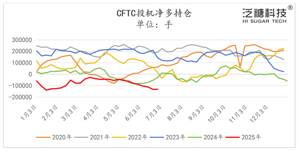 截至7月8日当周,ICE原糖期货+期权总持仓为985518手,较前一周增加9951手。投机多头持仓175192手,较前一周增加1106手;投机空头持仓307440手,较前一周增加377手;投机净空持仓为132248手,较上周减少729手。