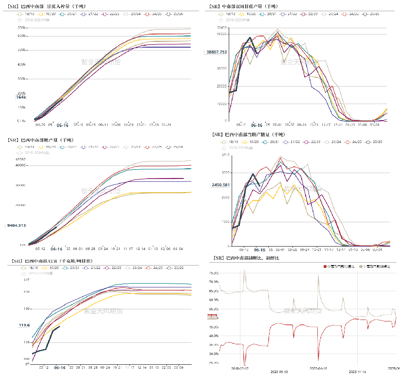 2025/26榨季截至6月上半月,巴西中南部地区累计入榨量为16357.5万吨,较去年同期的19093.7万吨减少2736.2万吨,同比降幅达14.33%;甘蔗ATR为119.6kg/吨,较去年同期的125.29kg/吨减少5.99kg/吨;累计制糖比为50.45%,较去年同期的48.33%增加2.12%;累计产糖量为940.4万吨,较去年同期的1101.6万吨减少161.2万吨,同比降幅达14.63%。
