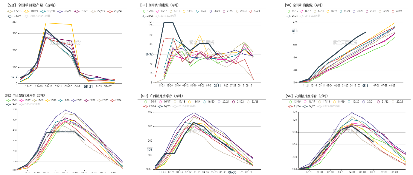 国内产销:偏多 截至5月底,全国累计产糖1116万吨,同比增120万吨;累计销糖811万吨,同比增152万吨;销售进度72.7%,同比加快6.5个百分点。
