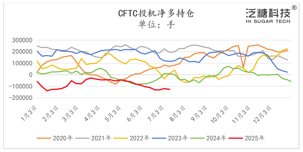 截至7月22日当周,ICE原糖期货+期权总持仓为999710手,较前一周增加5828手。投机多头持仓176410手,较前一周减少4736手;投机空头持仓304535手,较前一周增加1487手;投机净空持仓为128125手,较上周增加6223手。