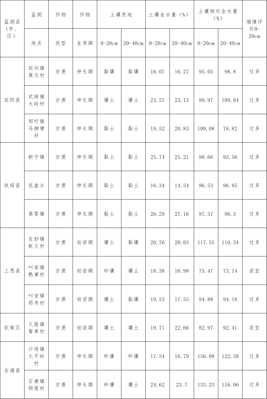 桂南地区:扶绥县监测点土壤相对含水量为96.53%—98.66%,墒情过多,监测点周边主要作物甘蔗,与去年同期相比略矮一两节;合浦县监测点土壤相对含水量为128.83%—156.08%,墒情过多,监测点周边主要作物甘蔗、木薯,木薯现阶段处于块根膨大期,甘蔗现阶段处于伸长期,目前暂未施肥;上思县监测点土壤相对含水量为75.47%—117.55%,墒情适宜至过多,监测点周边主要作物甘蔗,与去年同期相比矮了一节多,施肥情况:县糖厂推荐亩施有机无机复混肥30—40公斤,尿素27—31公斤,氯化钾23—27公斤;钦南区监测点土壤相对含水量为82.97%—90.91%,墒情适宜至过多,监测点周边主要作物甘蔗和木薯,新根蔗大部分已进入拔节期。