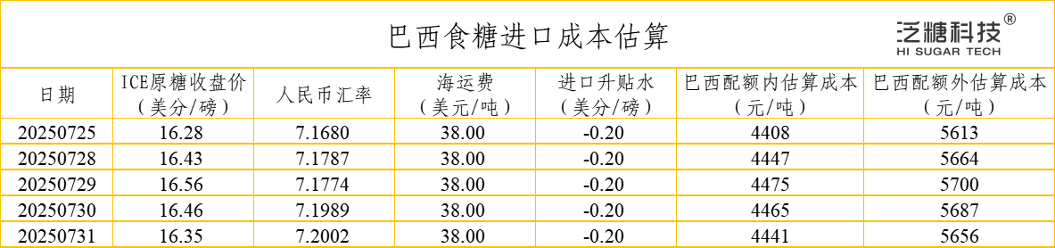 2025年7月31日,ICE原糖主力合约收盘价为16.35美分/磅,人民币汇率为7.2002。经测算,配额内巴西糖加工完税估算成本4441元/吨,配额外巴西糖加工完税估算成本为5656元/吨;与日照白糖现货价比,配额内巴西糖加工完税估算利润为1689元/吨,配额外巴西糖加工完税估算利润为474元/吨。