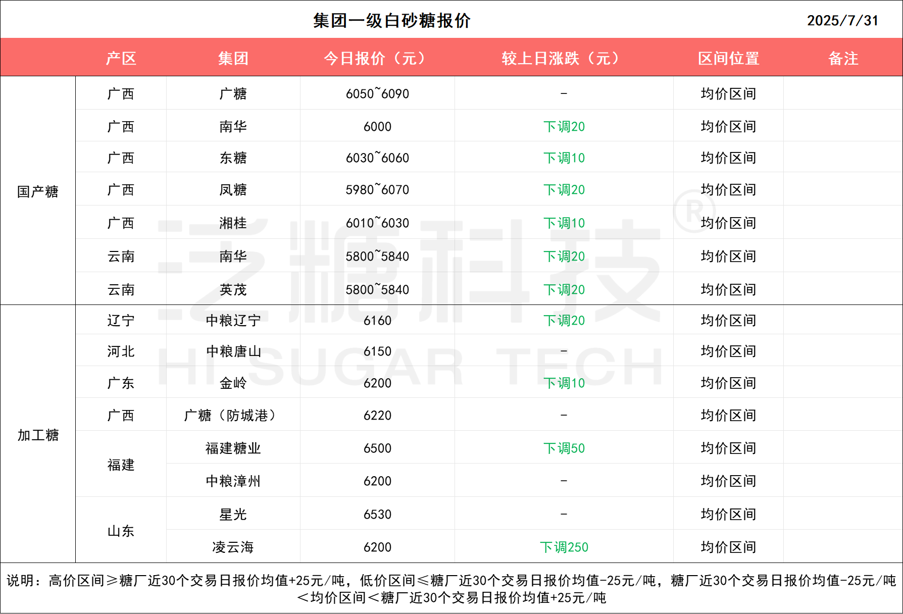 今日广西白糖现货成交价5955元/吨,下跌9元/吨;广西制糖集团报价5980~6070元/吨,下调10~20元/吨;云南制糖集团报价5800~5840元/吨,下调20元/吨;加工糖厂主流报价区间6150~6500元/吨,部分下调10~50元/吨。现货报价普遍下调,刺激部分刚需采购,但下游终端观望情绪较浓,现货走量整体一般。