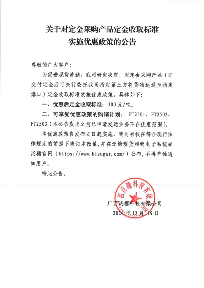 关于对定金采购产品定金收取标准实施优惠政策的公告