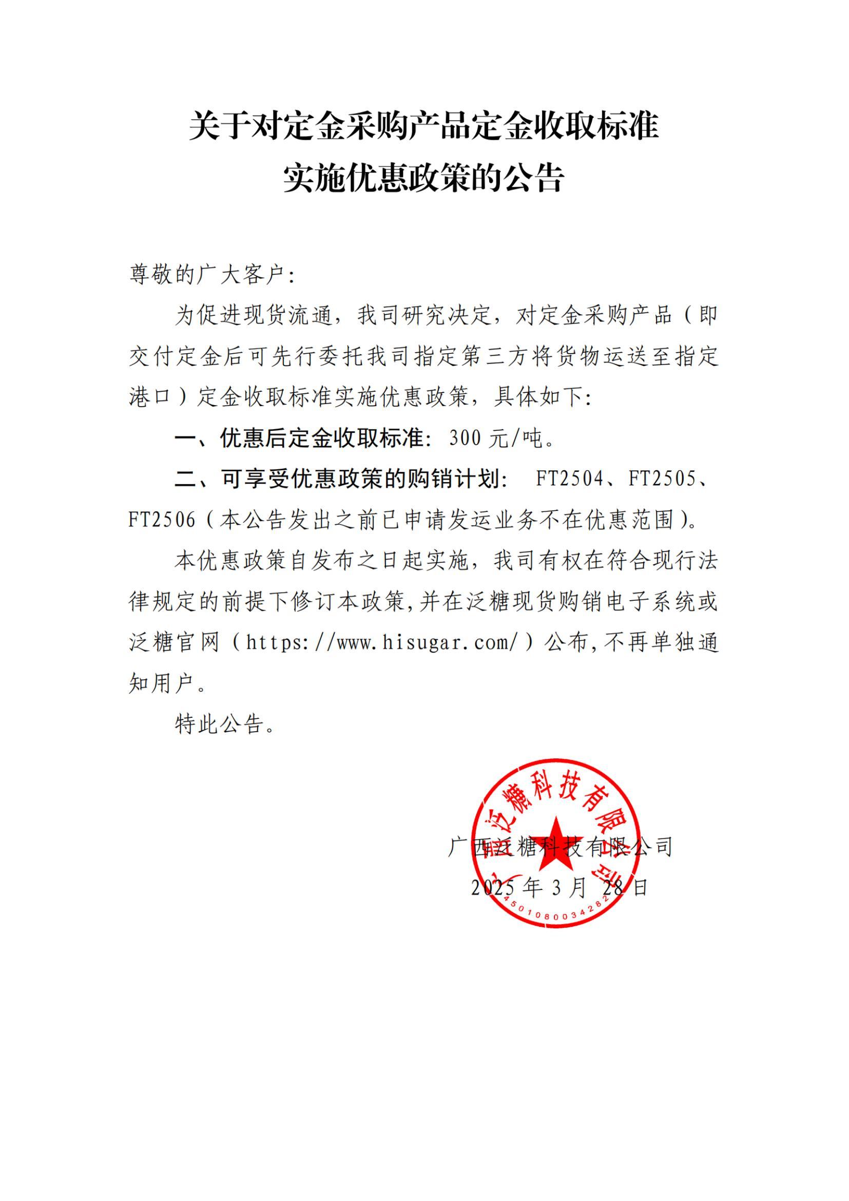 关于对定金采购产品定金收取标准实施优惠政策的公告