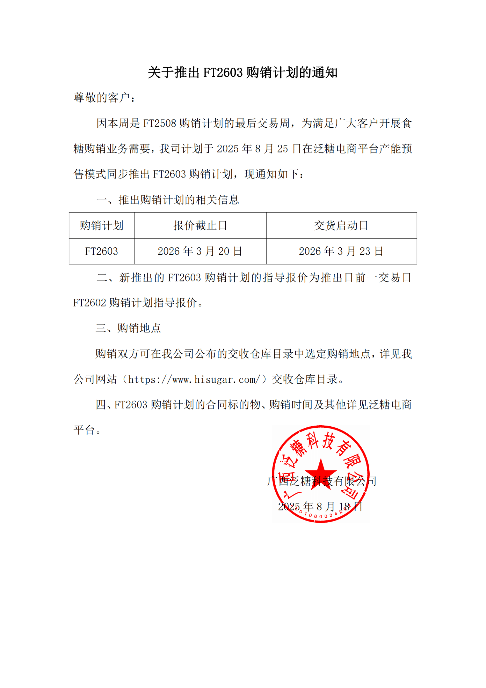 关于推出FT2603购销计划的通知