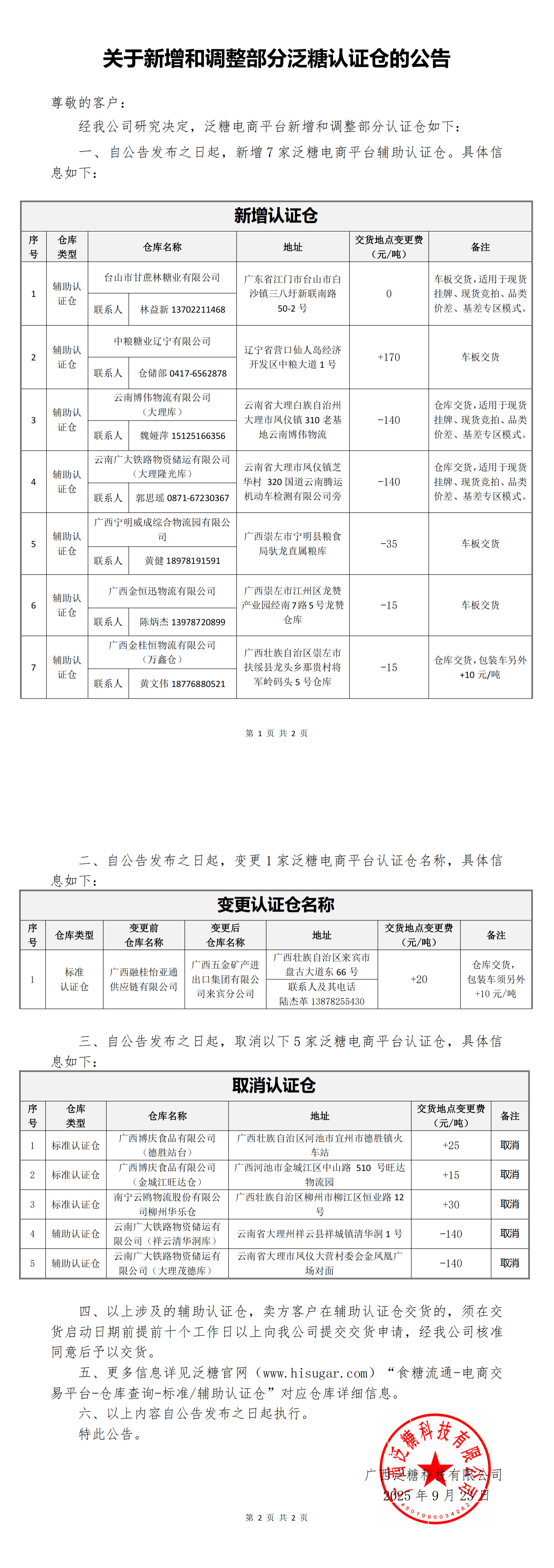 关于新增和调整部分泛糖认证仓的公告
