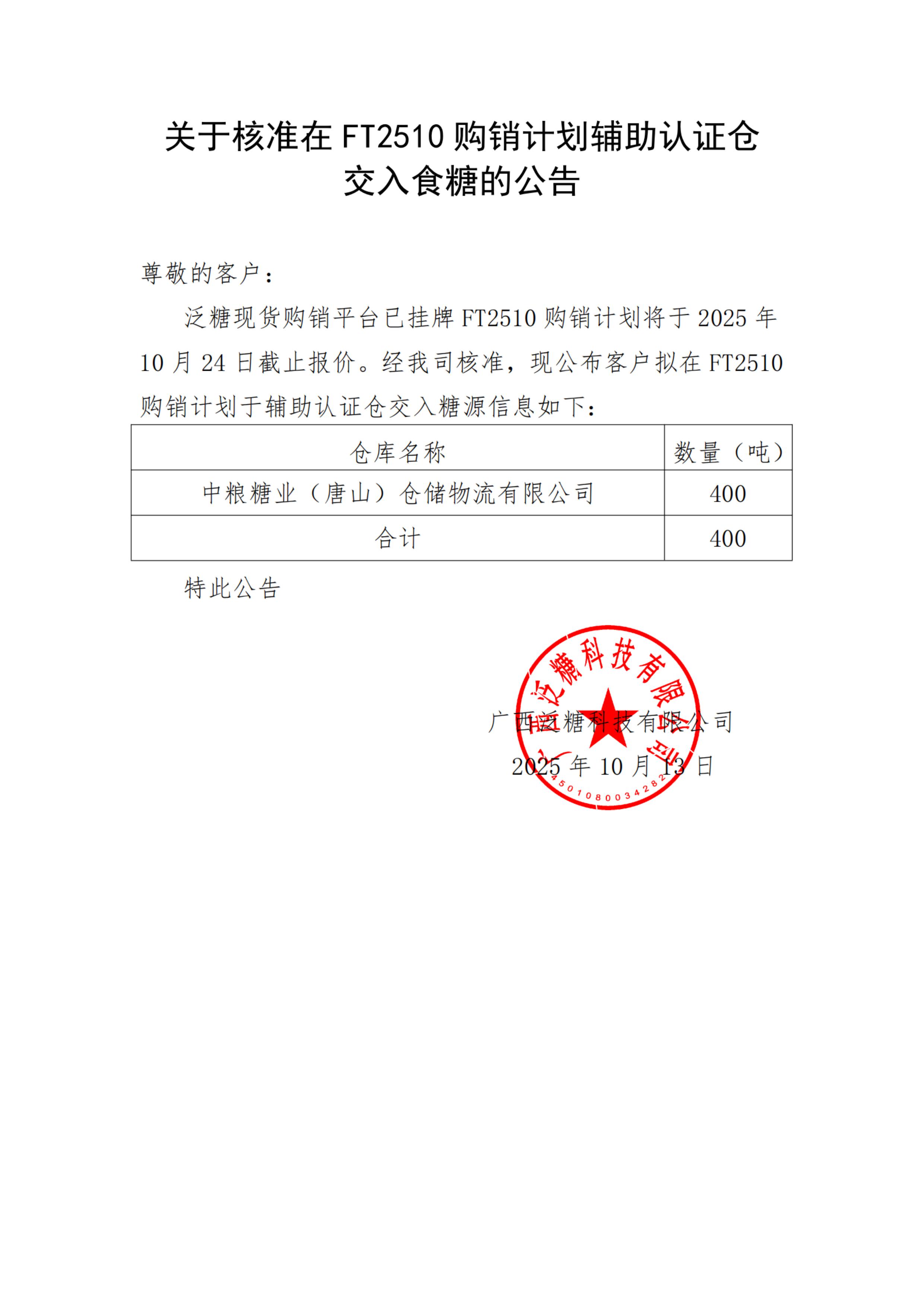 关于核准FT2510合约辅助认证仓交入食糖的公告