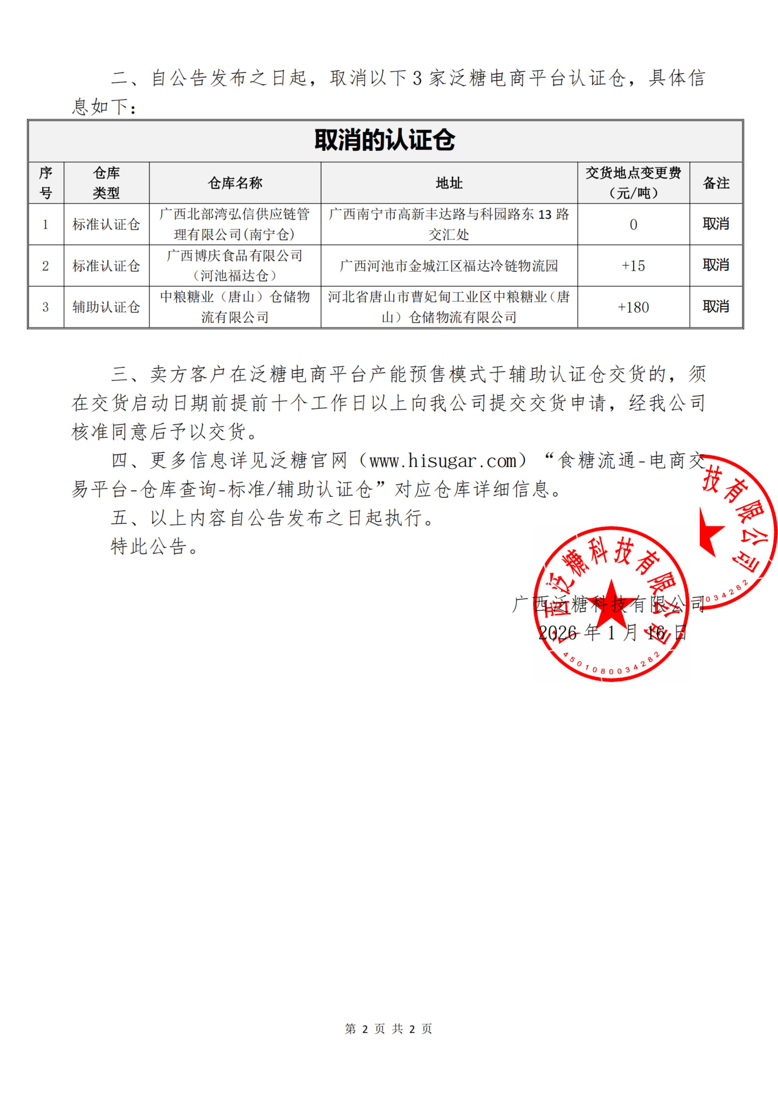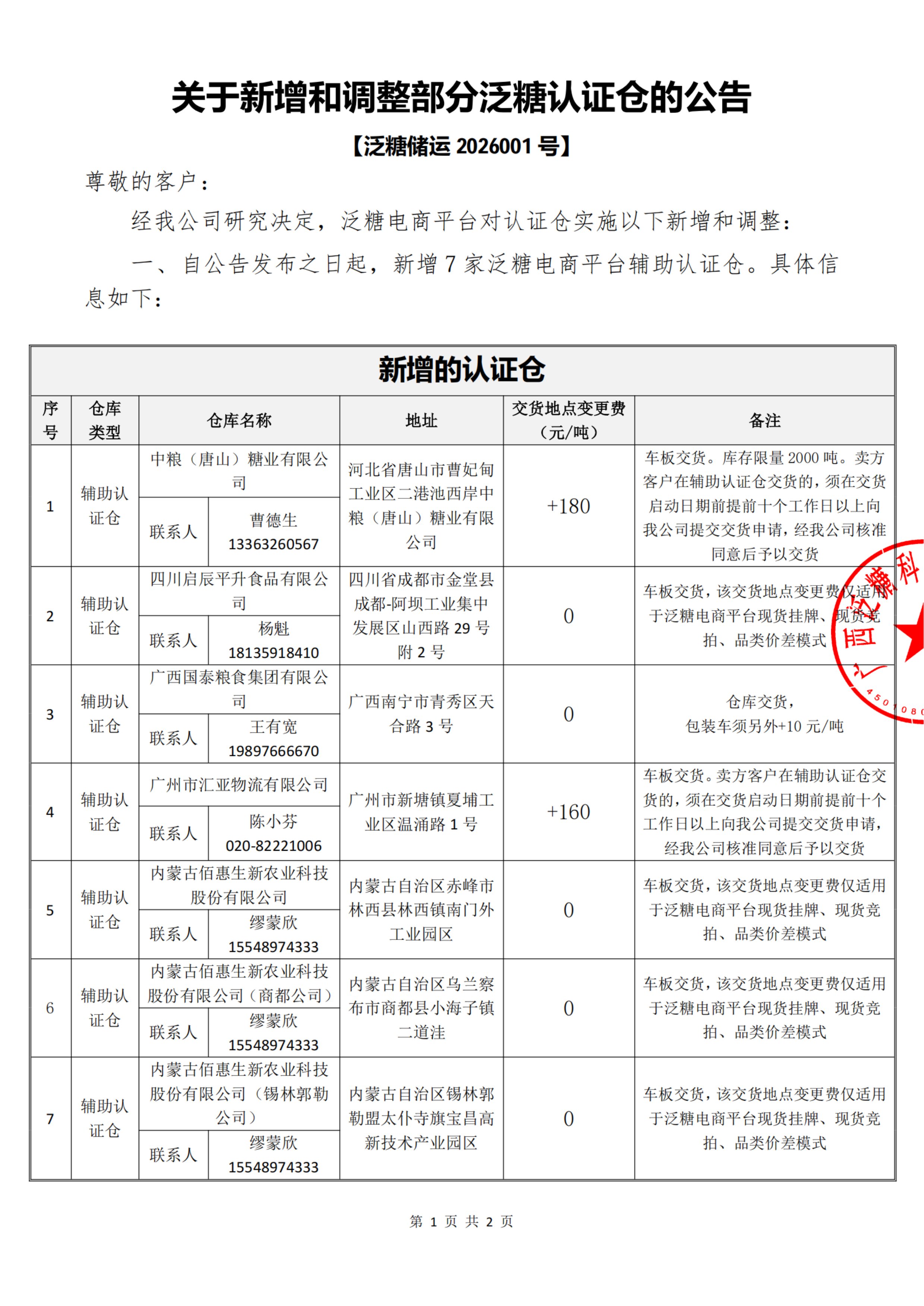 关于新增和调整部分泛糖认证仓的公告 【泛糖储运 2026001号】