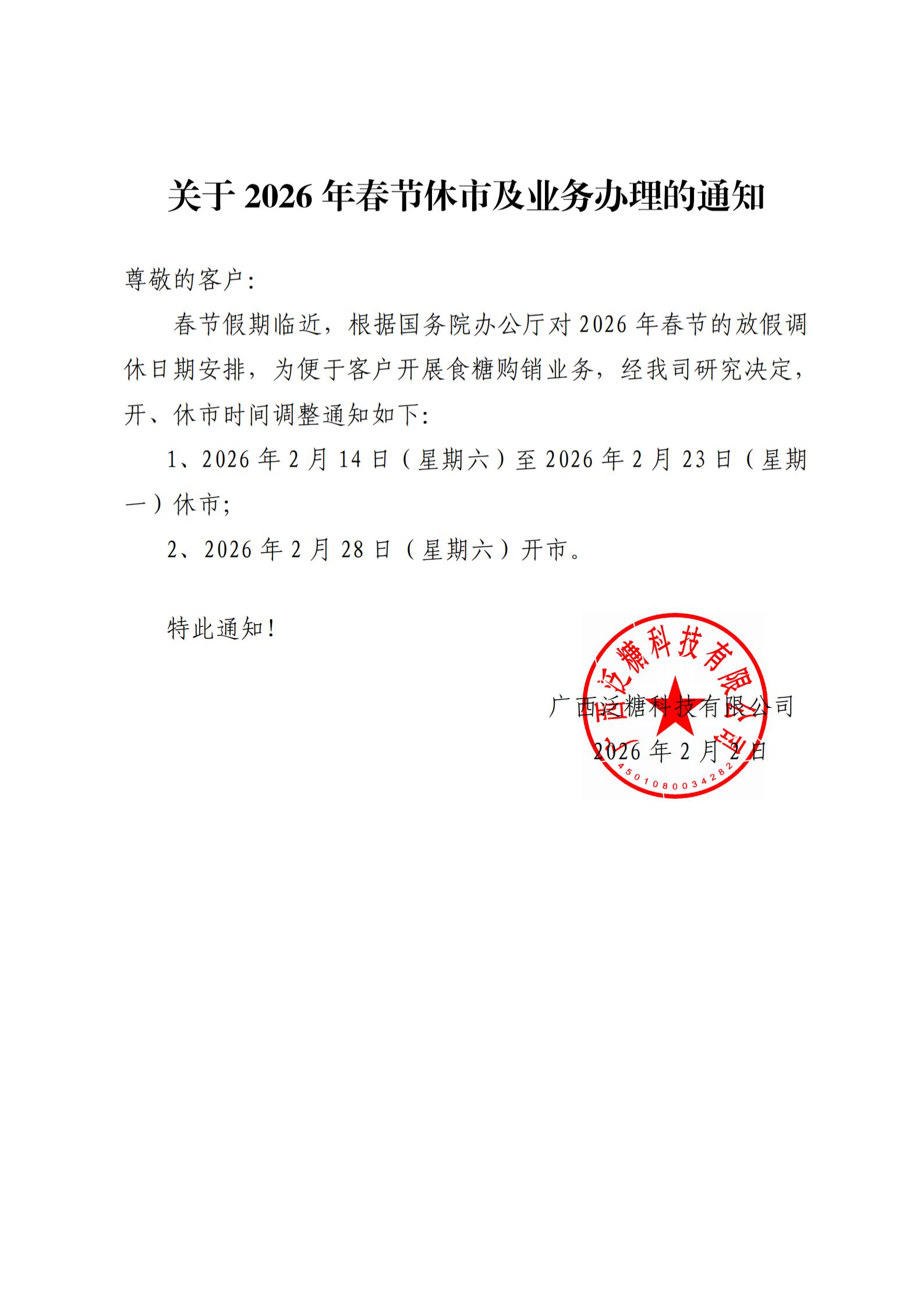 关于2026年春节休市及业务办理的通知
